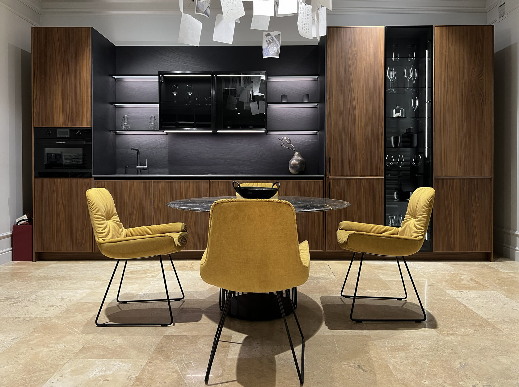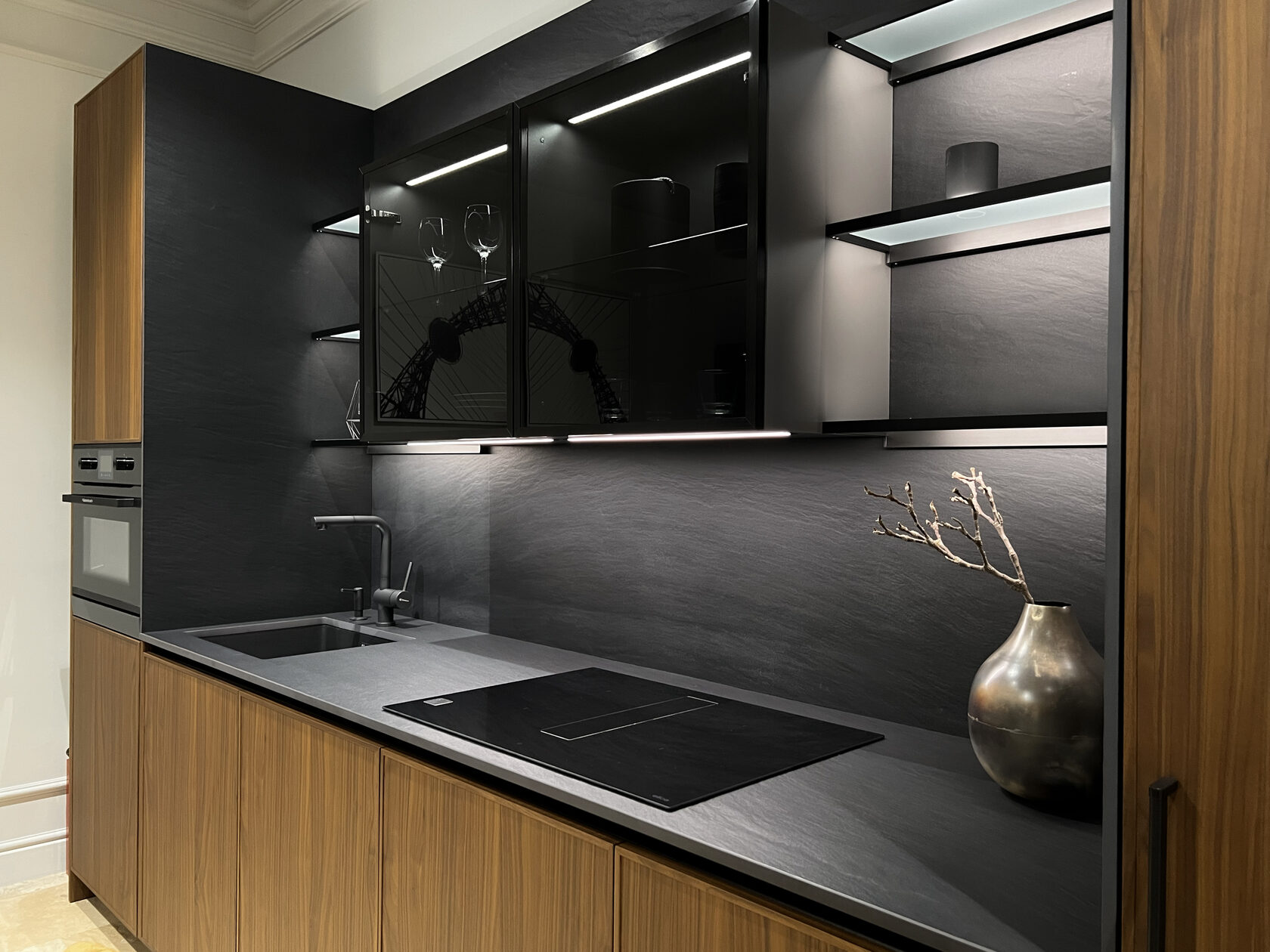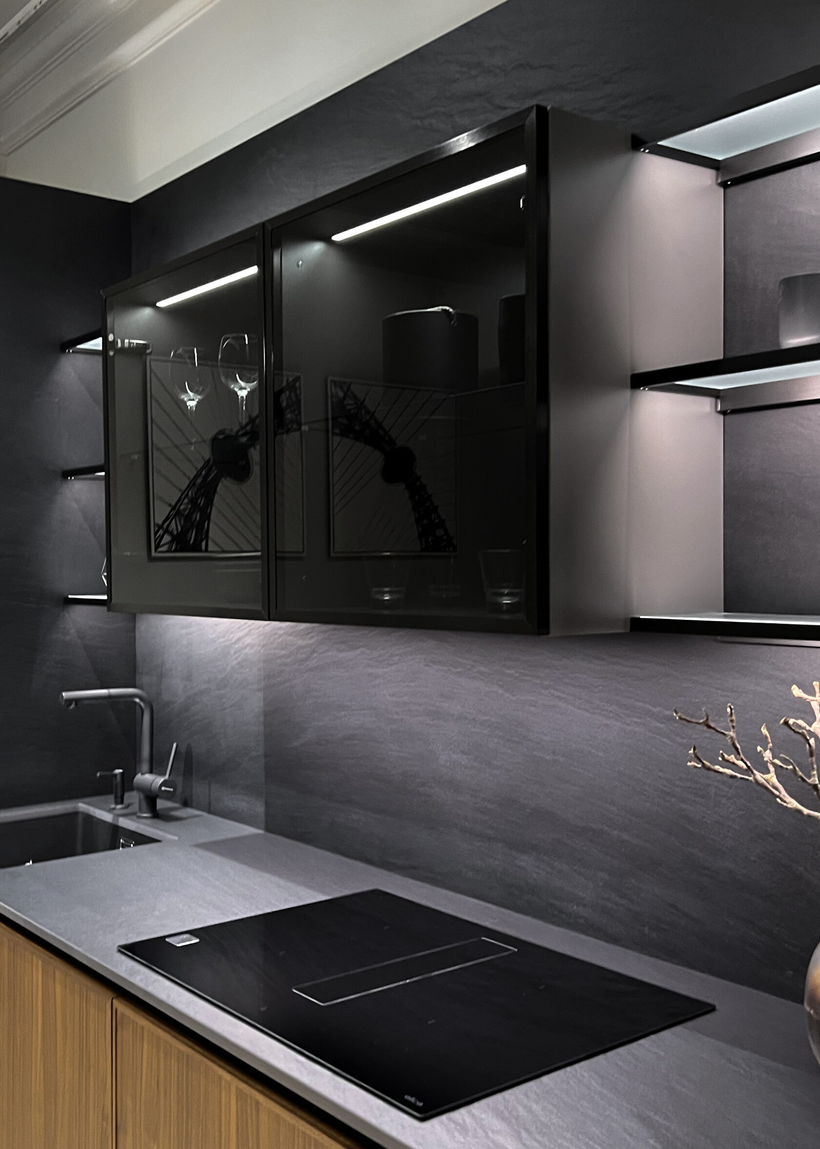 Главной особенностью новой экспозиционной кухни является центральная композиция: вместо традиционных верхних шкафов использованы витрины, обрамленные полками с подсветкой.