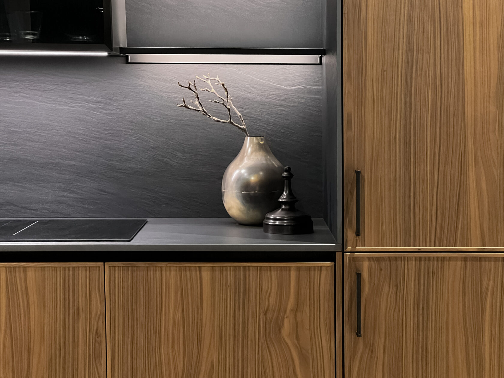 Фабрика Hacker в 2025 году представила новую модель фасада, выполненного из шпона ореха с изящной тоненькой рамкой в цвет.